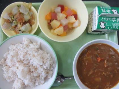 夏野菜カレー(麦ごはん、カレールウ)、福神和え、フルーツカクテル、牛乳