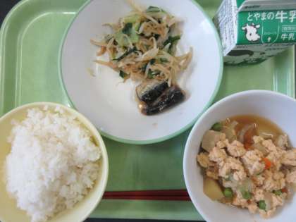 ごはん、チンゲンサイひたし、いわしのマーマレード煮、高野どうふの錦とじ、牛乳