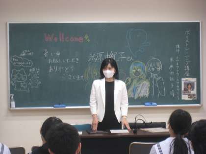 米原さんに指導していただくのは2年ぶり。この日を心待ちにしていた部員たちは、黒板にイラストとメッセージを書いてお迎えしました。