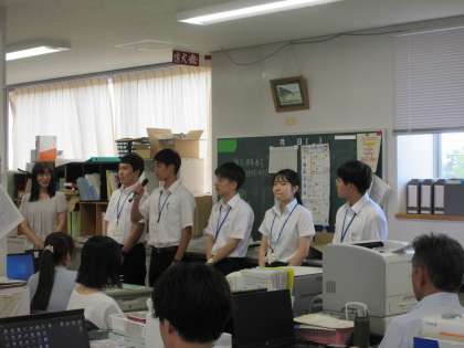 職員室では、5名の教育実習生(1名は実習体験)が紹介されました。一人ずつ実習期間の抱負を述べました。