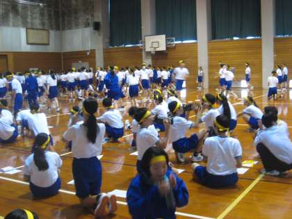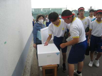 また、練習の合間に体を冷やせるよう、発泡スチロールの箱に氷を入れて置きました。小さい氷ですが、生徒たちは「気持ちいい!」と喜んでいました。