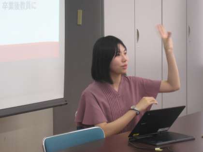 放課後、二人の初任教員が教育実習生に「教員の魅力」を語る研修会を行いました。