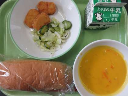 コッペパン、えごまドレッシングサラダ、チキンナゲット、かぼちゃポタージュ、牛乳