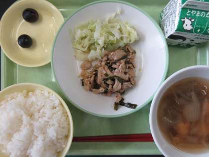 ごはん、豚キムチ丼、ゆでキャベツ、茎わかめスープ、巨峰、牛乳