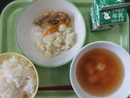 ごはん、すまし汁、こふきいも、ふくらぎのマリネ、牛乳
