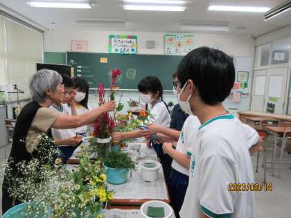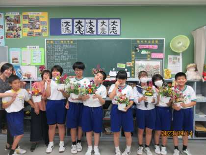 もうすぐ敬老の日を迎えることから、「家族へのプレゼントを作成しよう」という学習で、フラワーアレンジメント作りに挑戦しました。学校の花壇の花たちが、見事な作品に生まれ変わりました。