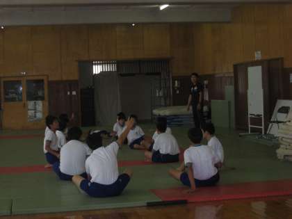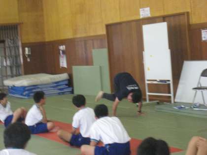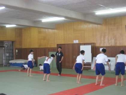 1年生の保健体育では、動きが変わる度に手本を見せ、生徒にイメージをもたせながら活動を進めていました。