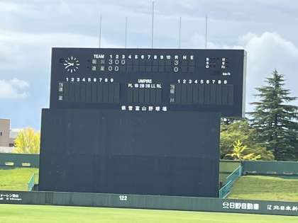 県営球場3回表終わって3-0でリードしています。がんばれ!堀川!