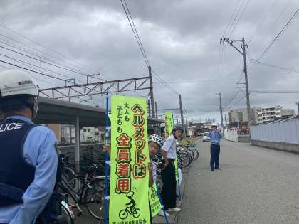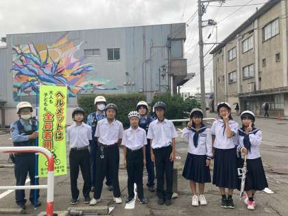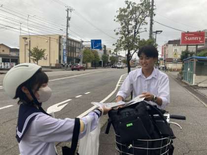本校1年生7名が南富山駅周辺で富山南警察署の方とともに、ヘルメットの着用を呼びかけました。最初、生徒たちは戸惑いも見られましたが、慣れてくると積極的に声をかけ行く姿が見られました。ヘルメットをかぶって自転車に乗ることが習慣化することを願っています。