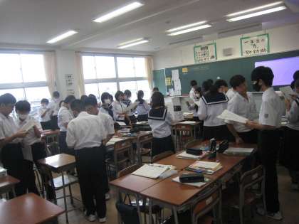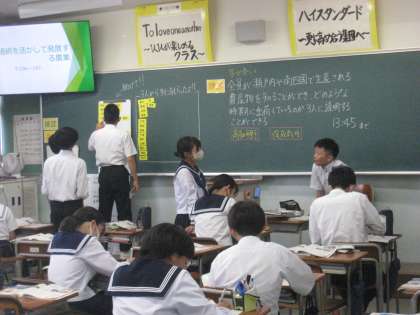 堀川中学校で力を入れている『学び合い』を取り入れた授業を公開するクラスが多く、生徒が自由に席を立って教え合う姿に興味深げな様子でした。