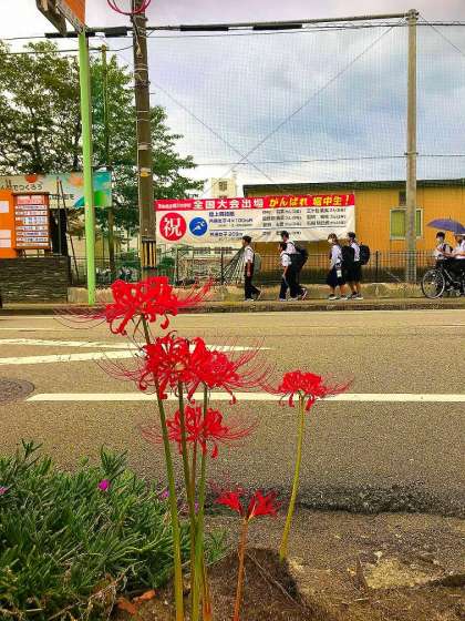 写真のような真っ赤なヒガンバナは、いずみ高校前の歩道にも咲いています。ぜひご覧ください。