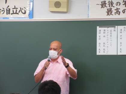 「中学校1年生の時に不安や寂しさを埋めるために使った薬物がゲートウェイドラッグとなり、様々な薬物に依存するようになった。入退院を繰り返し、心も体もボロボロになった。路上生活者となって、体重が40キロまでやせたときに、『ダルク』に出会い、自分を取り戻すことができた。身近に相談できる大人、相談できる友人をつくることが非常に大切なことに気付けた。人には、居場所がとても大切です。それを見付けてください。」
