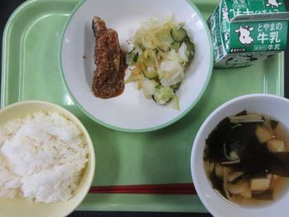 ごはん、あわせ和え、ふくらぎのごまだれかけ、マコモタケのお吸い物、牛乳