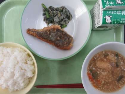 ごはん、厚揚げのそぼろ煮、よごし、揚げ魚のレモン味、牛乳