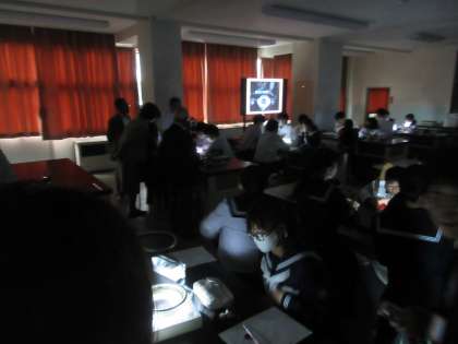 理科室では、放射線講座が行われており、霧箱に放射線の通った跡が見えることに歓声があがっていました。