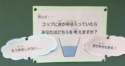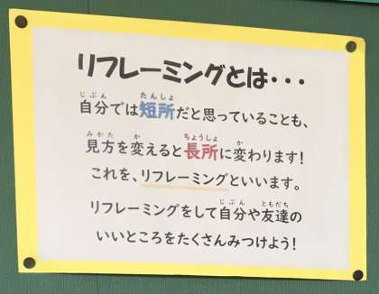 今回は、「リフレ−ミング」です。生徒は、ハートの形を裏返し「そう考えるといいんだ!」と納得していました。