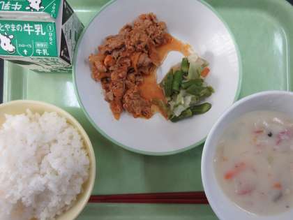 ごはん、秋の香りシチュー、アスパラサラダ、ポークチャップ、牛乳