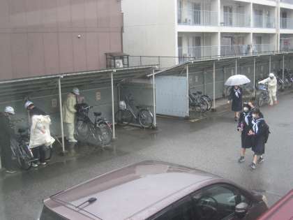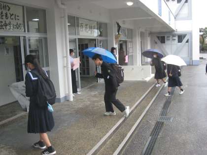 雨が降る寒い朝でしたが、登校する生徒たちは元気な表情でした。