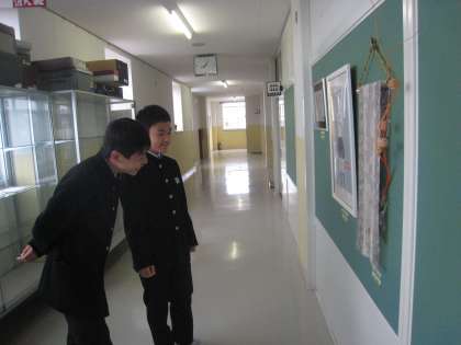 登校後、会議室前廊下に展示された作品を見に来ている生徒の姿がありました。