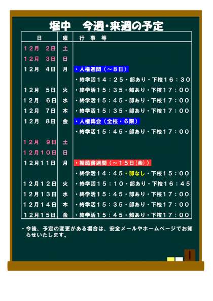 12月1日(金) 来週・再来週の予定