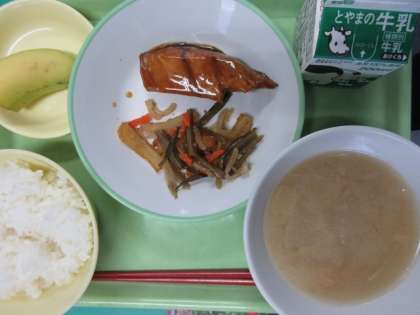 ごはん、茎わかめのきんぴら、ふくらぎの照り焼き、具だくさん汁、バナナ、牛乳