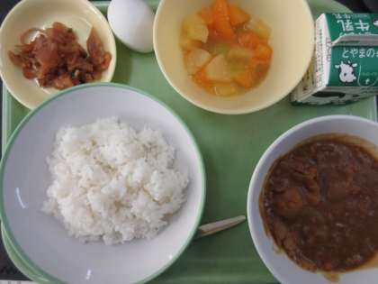 ごはん、カレールウ、ゆで卵、福神漬、フルーツゼリーミックス、牛乳