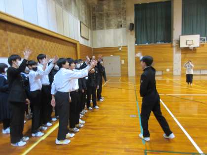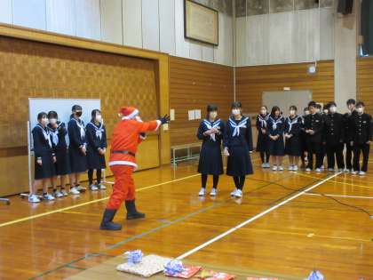 最初に行ったじゃんけん大会では、各クラスの1位が全員体育館に集合し、まずは生徒会長と対戦!そして、勝ち残った強者が謎のサンタクロースと対戦!見事じゃんけん王に輝いた生徒たちには「葉書」のプレゼントがありました。