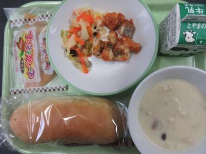 コッペパン、にんじんと豆のラペ、魚のアングレス、鶏肉のフリカッセ、ショコラクレープ、牛乳