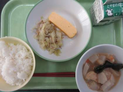 ごはん、ベーコンとエリンギのソテー、厚焼き卵、おでん、牛乳