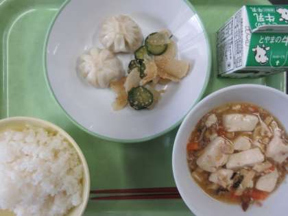ごはん、華風和え、えび包子、マーボー豆腐、牛乳