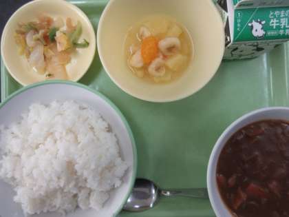 ごはん、ハヤシルウ、福神和え、フルーツミックス、牛乳