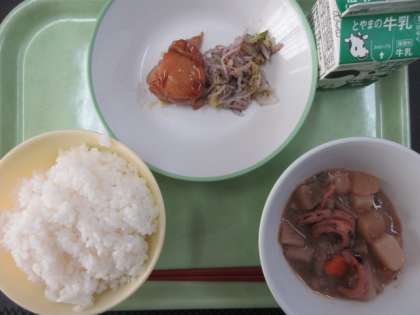 ごはん、ゆかり和え、照焼チキン、里芋といかの煮物、牛乳