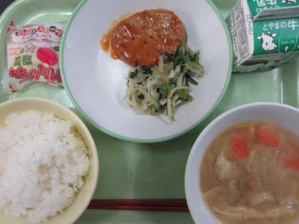 2月16日(金) 今日の給食 ※写真はハンバーグのケチャップ煮ともものタルト