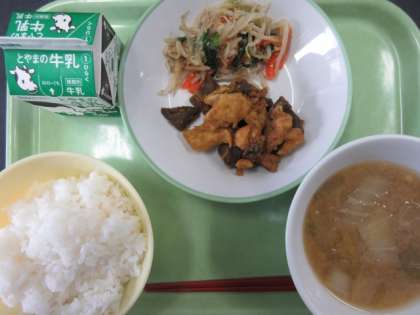 ごはん、たら汁、ナムル、鶏肉とレバーのカレー風味、牛乳