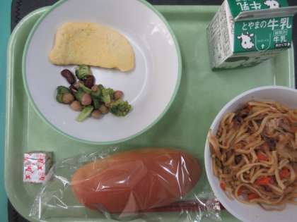 減量コッペパン、ビーンズサラダ、オムレツ、焼きそば、ポケットチーズ、牛乳
