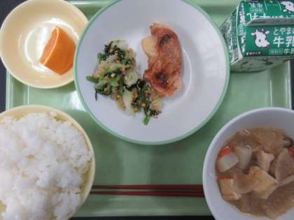 ごはん、いり大豆和え、赤魚の塩焼き、根菜のごま煮、清見オレンジ、牛乳