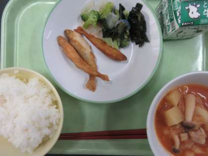 ごはん、こんにゃくサラダ、わかさぎのフリッター、鶏肉のトマト煮、牛乳
