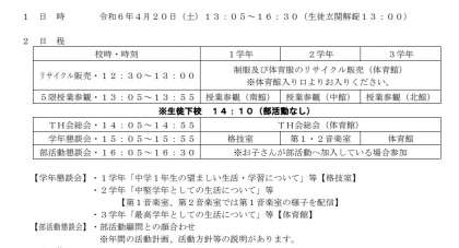 明後日4月20日(土)は、授業参観・TH会総会(制服リサイクル)・学年懇談会・部活動懇談会が行われます。