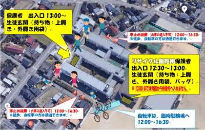 リサイクル販売中は、13:00まで校舎内への立ち入りはできません。)