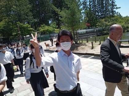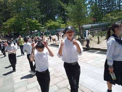5組 東大寺で大仏を見学した後、鹿と仲良くしています。