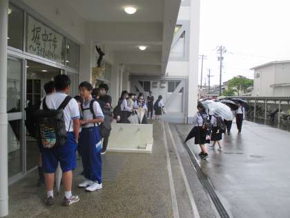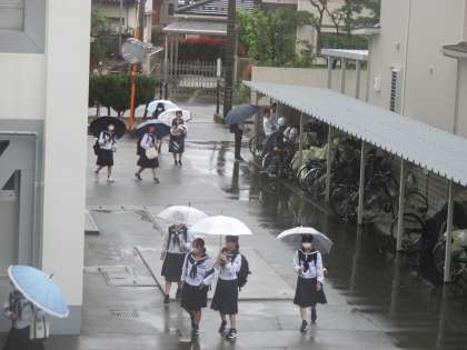 5月28日(火)、雨の中の登校になりました。このあと1年生は、校外学習に出発します。