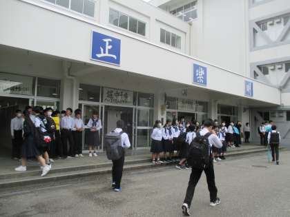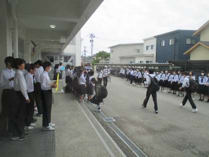 6月3日(月)、6月がスタートしました。「各部で繋ごう挨拶バトン」4日目の担当は、サッカー部、ハンドボール部女子、演劇部です。さわやかな挨拶の声が、響き渡っていました。