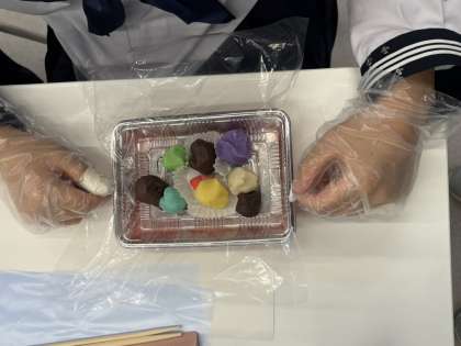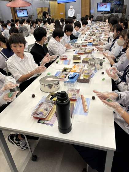 説明を受けながら、丁寧に和菓子をつくっています。