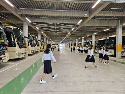 生徒たちは、バスの駐車場の雰囲気に驚いています。