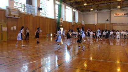 ?女子バスケットボール部、前半終わりました。善戦し、現在63対2。勝っています。