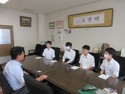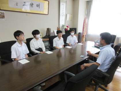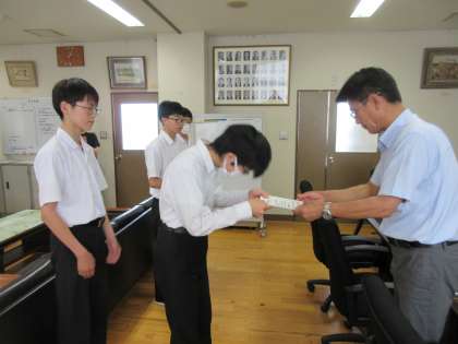 7月12日(金)、第1回「堀川プライド賞」の受賞式・懇談会が校長室で行われました。今回受賞したのは、中田くん(3年)、中井くん(2年)、田中くん(2年)、平井くん(2年)です。