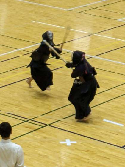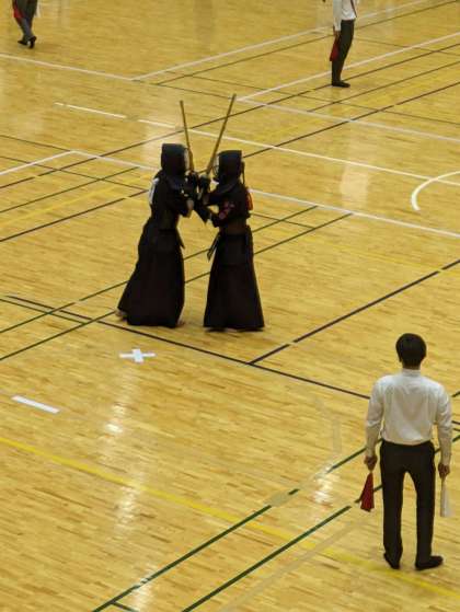 先鋒中井(弟)君、激しいつばぜり合い、両者一歩も譲らず、引き分けでした。