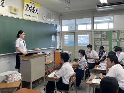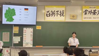 Am 16. Juli, in der 6. Stunde des integrierten Lernens, hielt die Austauschschülerin Nana Isogai aus Deutschland für die Klasse 3-1 eine ausführliche und verständliche Präsentation über „deutsche Kultur und Schulleben“ mit Hilfe von PowerPoint in fließendem Japanisch. Die Schüler hörten aufmerksam zu, während sie ihre Erklärungen gab.