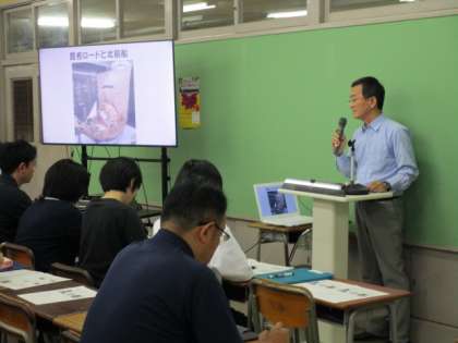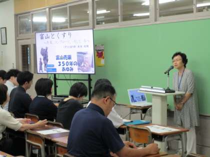 「富山とくすり 〜売薬、昆布ロード、そして今に続く〜」と題して、くすりの語り部である安岡隆様と松本知子先生(本校理科担当)のお二人を講師にお迎えしました。