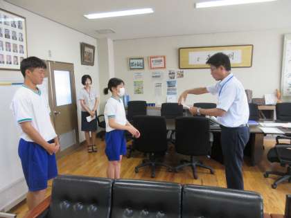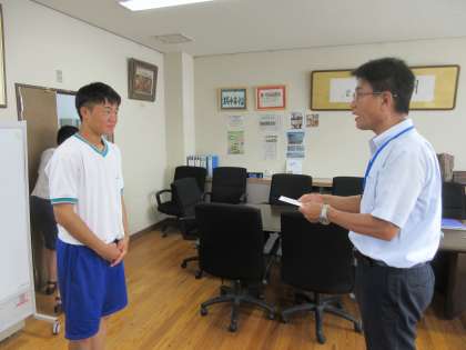 8月27(火)始業式終了後、全国大会出場を讃え、校長室で竹脇校長先生から、2名の生徒にTH会激励費を手渡しました。